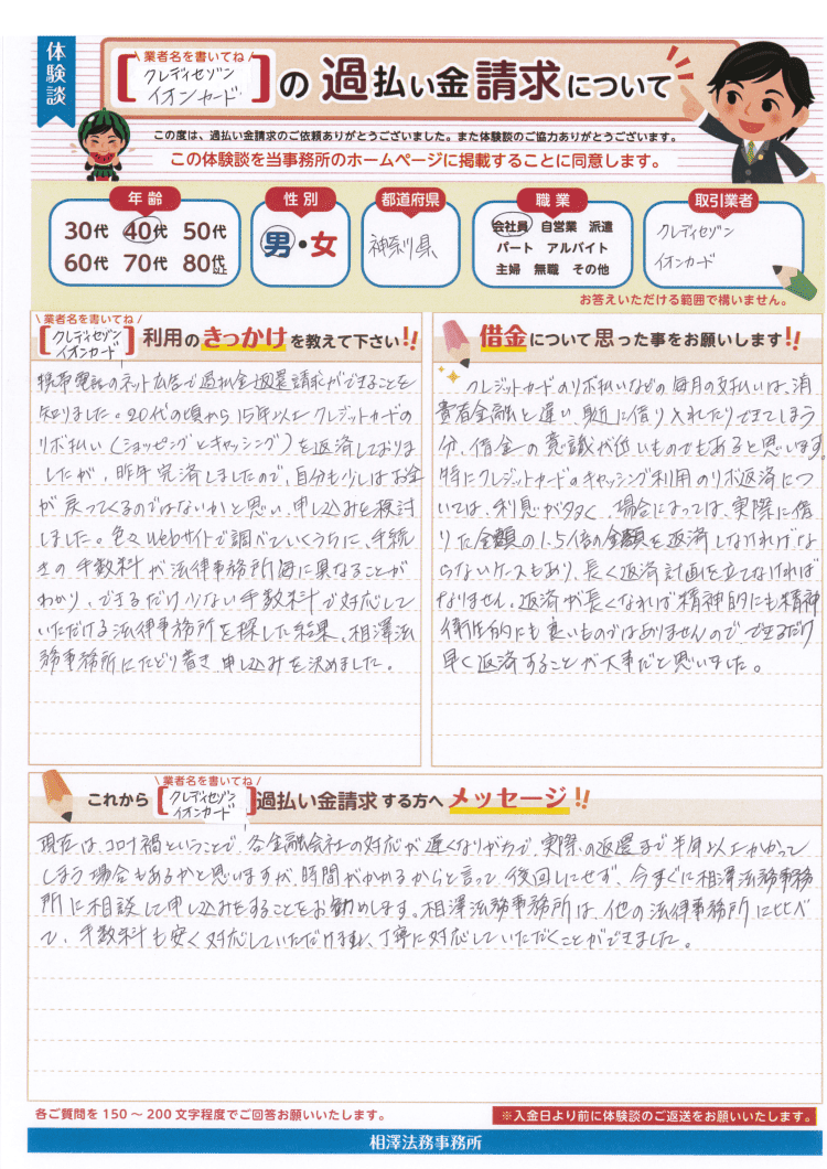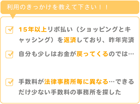 20代の頃から15年以上クレジットカードのリボ払い(ショッピングとキャッシング)を返済しておりましたが、昨年完済しましたので、自分も少しはお金が戻ってくるのではないかと思い、申し込みを検討しました。
