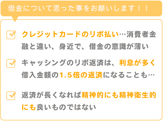 クレジットカードのリボ払いなどの毎月の支払いは、消費者金融と違い、身近に借り入れたりできてしまう分、借金の意識が近いものでもあると思います。
