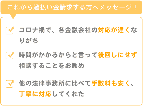 現在は、コロナ禍ということで、各金融会社の対応が遅くなりがちで、実際の返還まで半年以上かかってしまう場合もあるかと思いますが、時間がかかるからと言って、後回しにせず、今すぐに相澤法務事務所に相談して申し込みをすることをお勧めします。