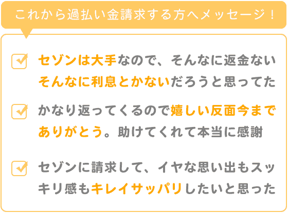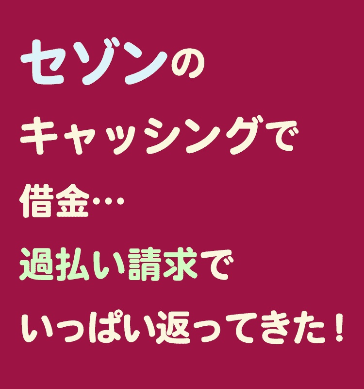 セゾンと聞くと、大手なので、(私的には笑)そんなに返ってこない、そんなに、利息とかないだろう、と思ってたのですが、かなり返ってくるので、うれしい反面、今まで、ありがとう、という気持ちになりました。