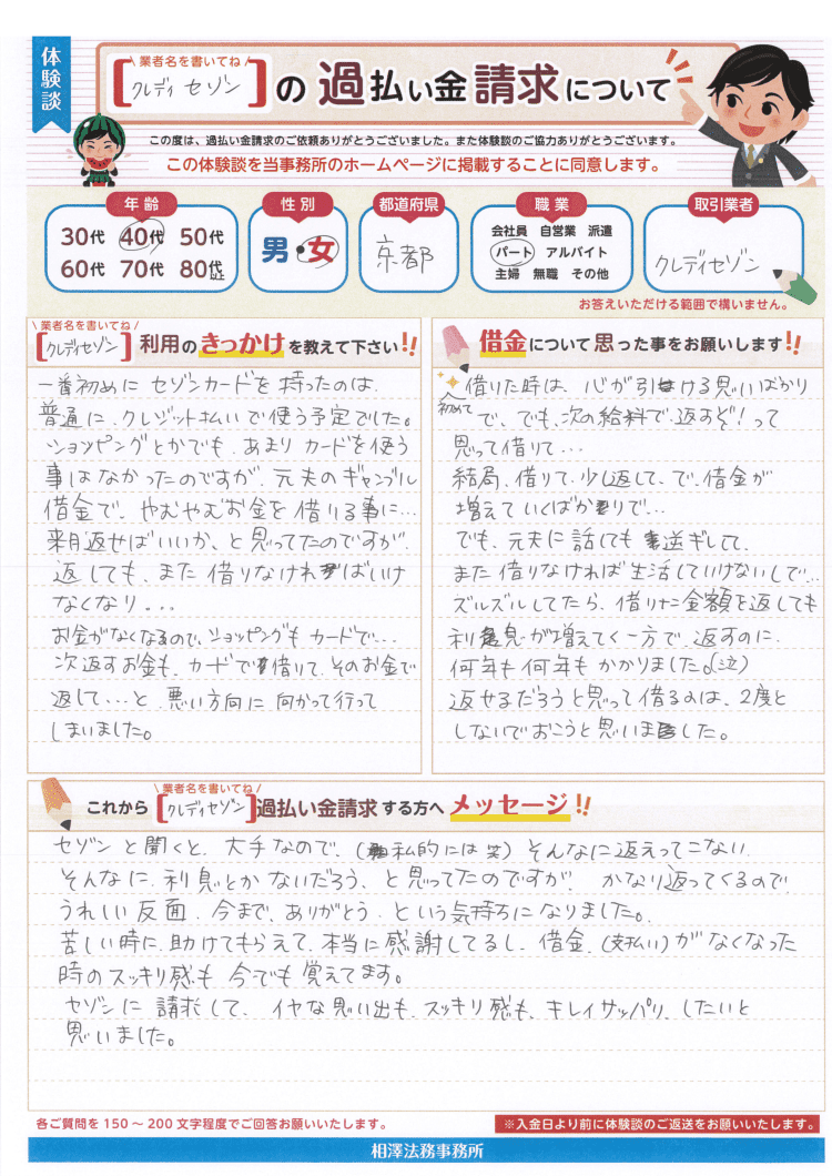 セゾンに請求して、イヤな思い出も、スッキリ感も、キレイサッパリ、したいと思いました。