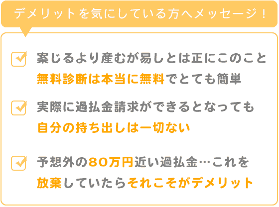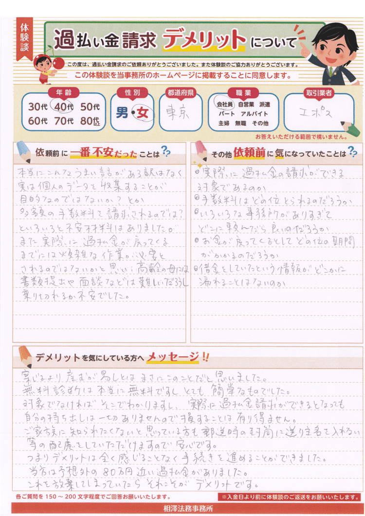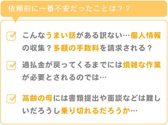 また実際に過払金が戻ってくるまでには煩雑な作業が必要とされるのではないかと思い、高齢の母には書類提出や面談などは難しいだろうし乗り切れるか不安でした。