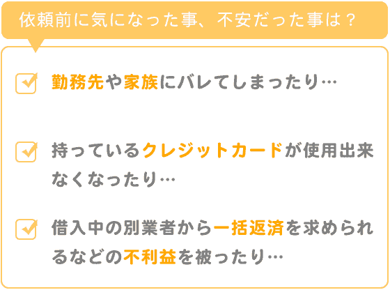 しかし、依頼することで借りた実績等々が働いている勤務先や家族にバレてしまったり、持っているクレジットカードが使用出来なくなってしまったり、今借り入れしている別の業者から一括返済を求められるなどの不利益を被るのではと思ったのでなかなか連絡することが出来ませんでした。