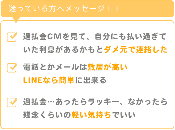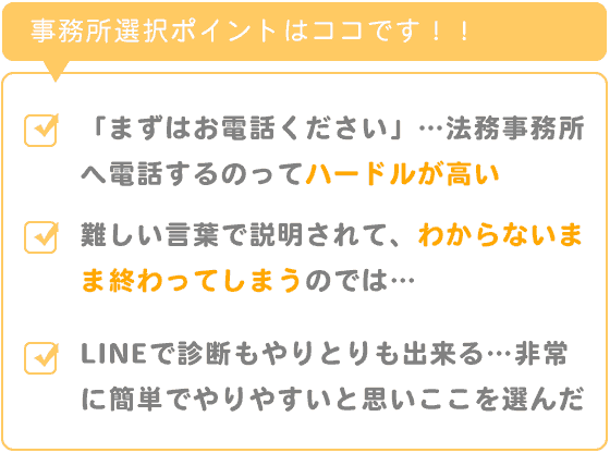 しかし、LINEから過払金診断が出来て、その後のやりとりもLINEで出来るって言うところが自分にとって非常に簡単でやりやすいと思ったので、この事務所を選びました。
