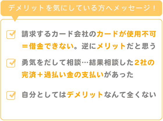 デメリットは借金をしていたカード会社のカードが使えなくなる事ぐらいだと思います。