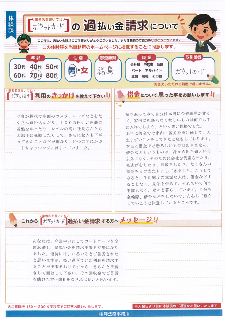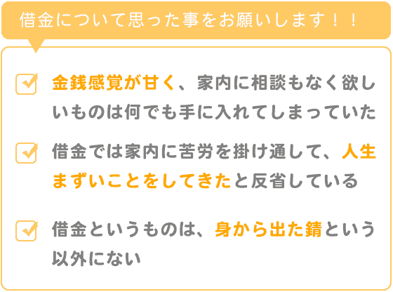 本当に借金では家内に苦労を掛け通して、人生まずいことをしてきたと反省しております。本当に借金ほど恐ろしいものはありません。