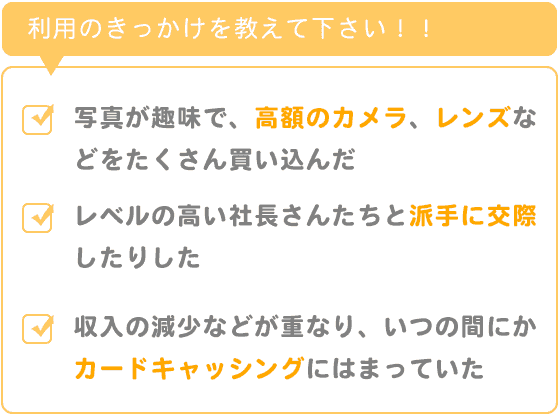 写真が趣味で高額のカメラ、レンズなどをたくさん買い込んだり、100万円近い囲碁の基盤をかったり、レベルの高い社長さんたちと派手に交際したりして、さらに収入も下がってきたことなどが重なり、いつの間にかカードキャッシングにはまっていました。