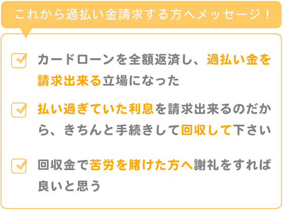 あなたは、今回幸いにしてカードローンを全額返済し、過払い金を請求出来る立場になりました。
