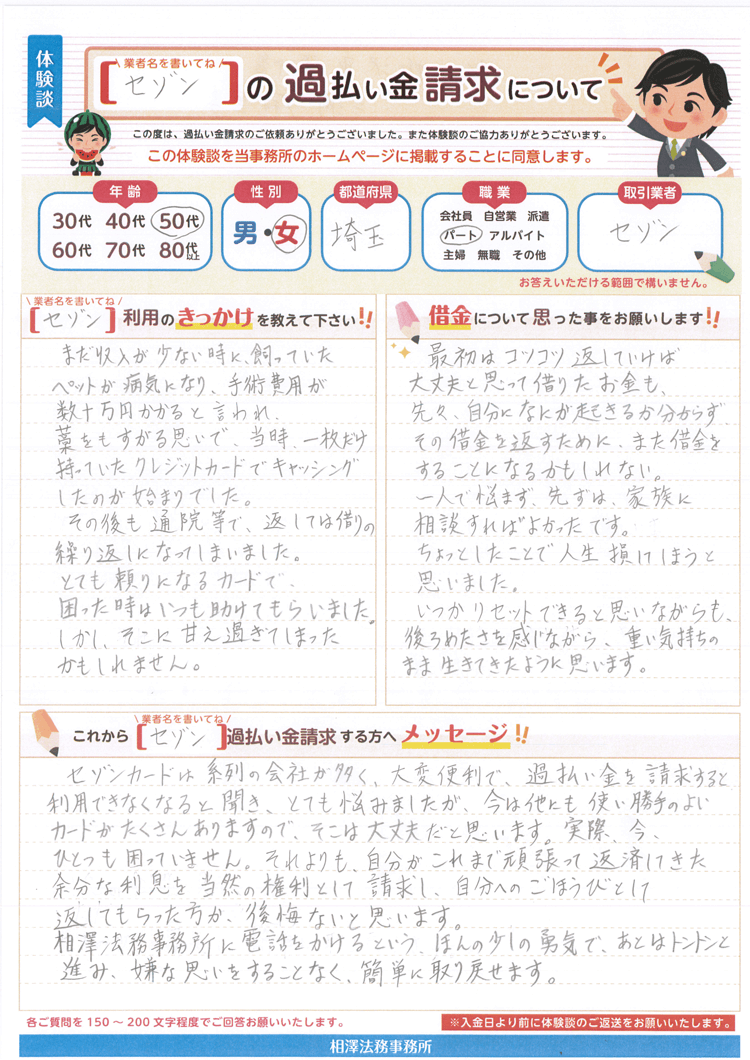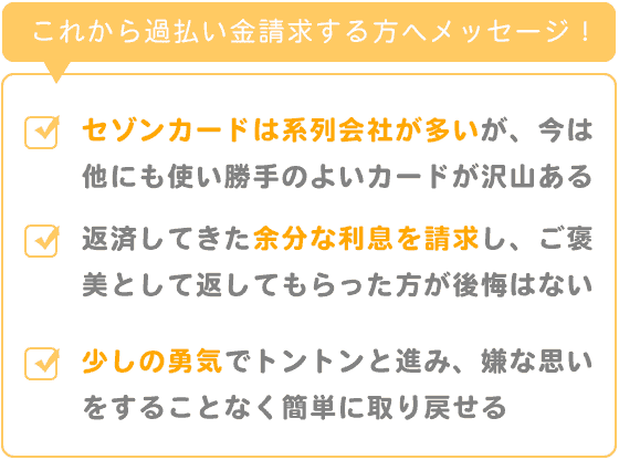 セゾンカードは系列の会社が多く、大変便利で、過払い金請求すると利用できなくなると聞き、とても悩みましたが、今は他にも使い勝手のよいカードがたくさんありますので、そこは大丈夫だと思います。