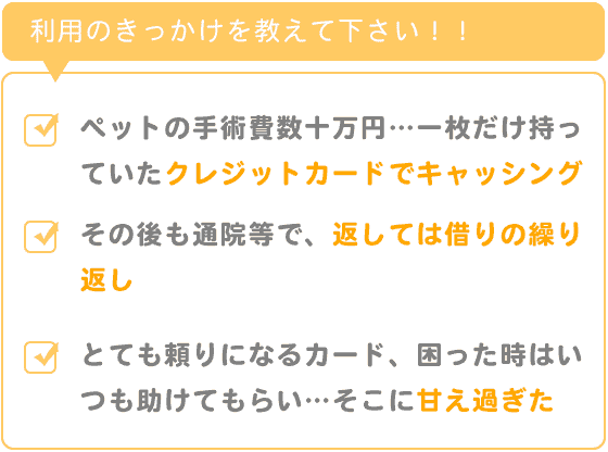 まだ収入が少ない時に、飼っていたペットが病気になり、手術費用が数十万円かかると言われ、藁をもすがる思いで、当時、一枚だけ持っていたクレジットカードでキャッシングしたのが始まりでした。