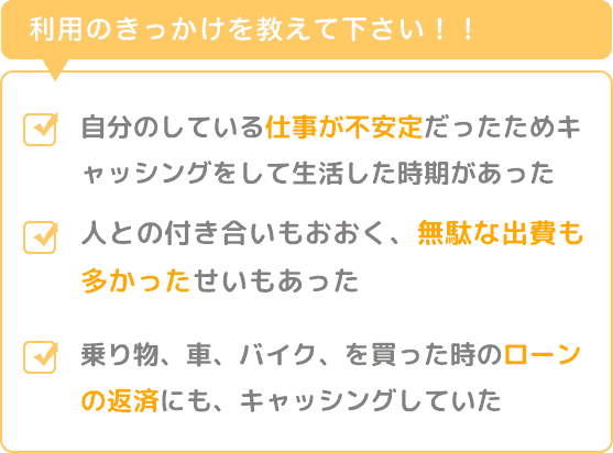 自分のしている仕事が不安定だったため、(仕事がある時とない時の差がはげしくて)キャッシングをして、生活した時期がありました。