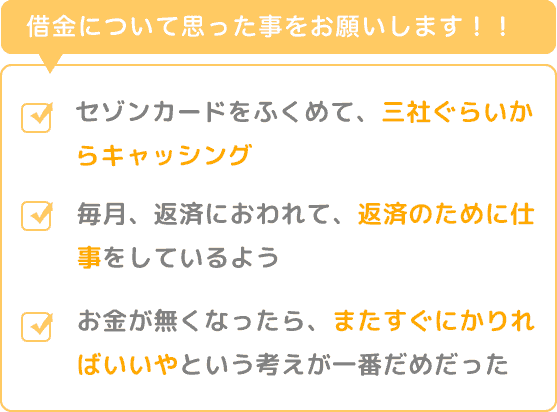 カードは、すぐにお金をかりれるのでお金が無くなったら、またすぐにかりればいいやと、いう考えが一番自分のだめだったところだと思っています。
