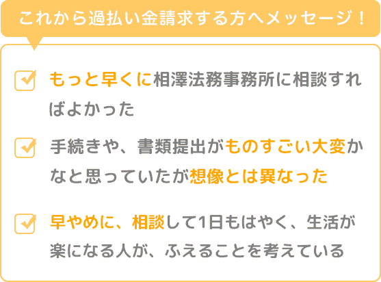 過払い金の事は、全々、わからなかったのですがもっと早くに相澤法務事務所に相談すれば、よかったと思ってます。