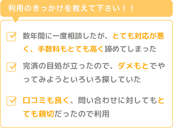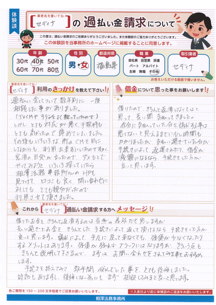 その後もいろいろな所のCMを目にしながらも、利用出来ずにいたのですが、完済の目処が立ったので、ダメもとでやってみようといろいろ探していたら相澤法務事務所さんのHPを見つけて、口コミも良く、問い合わせに対してもとても親切だったので利用させて頂きました。