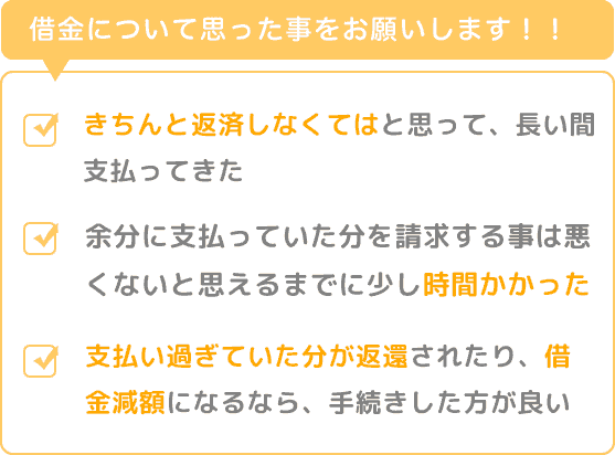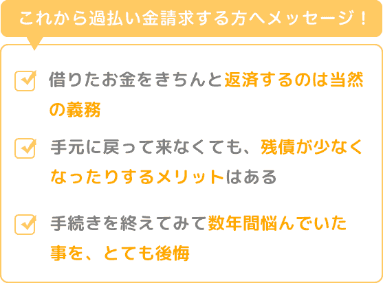 余分に支払っていた分を請求する事は悪くないと思えるまでに少し時間もかかりましたが、支払い過ぎていた分が手続きによって返還されたり、借金が減額になるなら、手続きをした方が良いと思います。