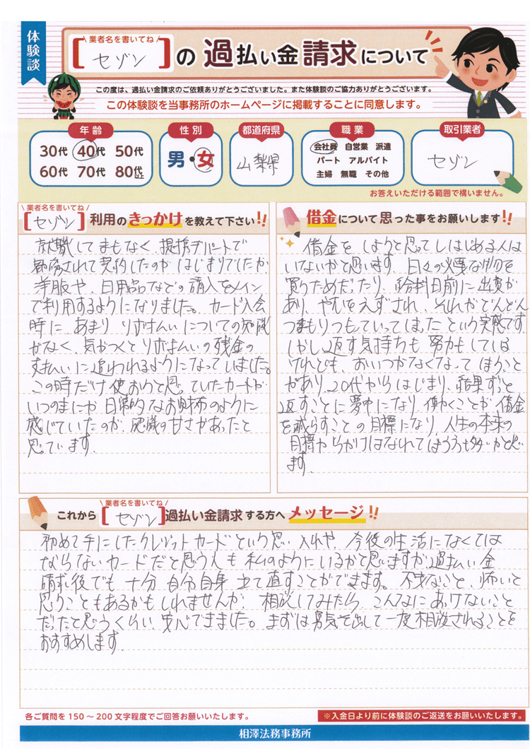 日々の必要な物を買うためだったり、給料日前に出費があり、やむをえずされ、それがどんどんつもりつもっていってしまったという実感です。