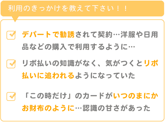カード入会時に、あまりリボ払いについての知識がなく、気がつくとリボ払いの残金の支払いに追われるようになっていました。