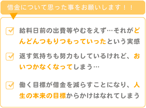しかし返す気持ちも努力もしているけれども、おいつかなくなってしまうことがあり、20代からはじまり、結果ずっと返すことに夢中になり、働くことが借金を減らすことの目標になり、人生の本来の目標からかけはなれてしまう方も多いかと思います。