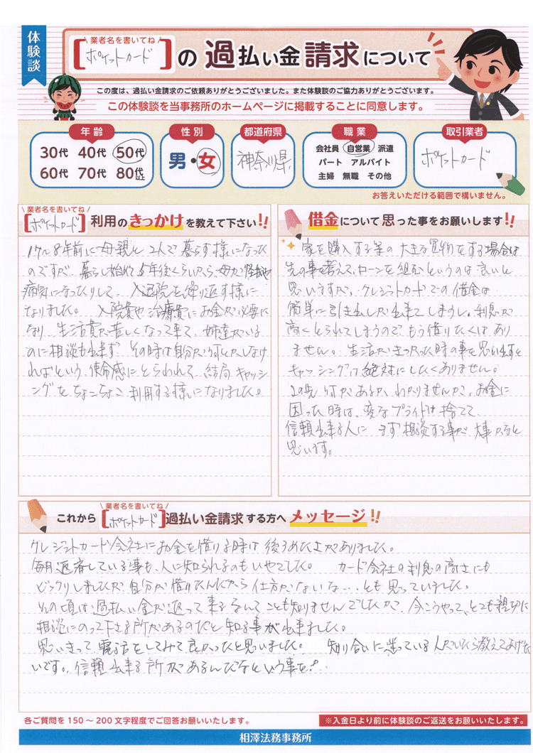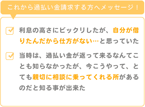 その頃は過払い金が返って来るなんてことも知りませんでしたが、今こうやって、とても親切に相談に乗って下さる所があるのだと知る事が出来ました。