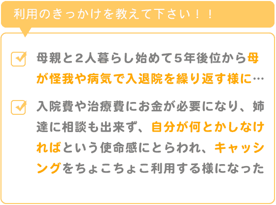 入院費や治療費にお金が必要になり、生活費が苦しくなって来て、姉達がいるのに相談も出来ず、その時は自分が何とかしなければという使命感にとらわれて、結局キャッシングをちょこちょこ利用する様になりました。