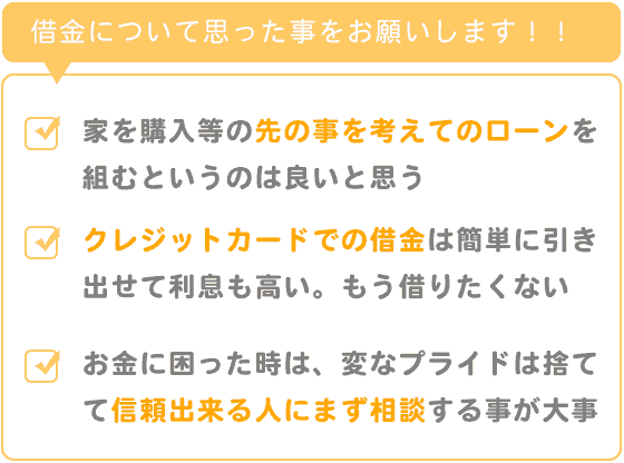 家を購入する等の大きな買物をする場合は先の事を考えて、ローンを組むというのは良いと思いますが、クレジットカードでの借金は簡単に引き出しが出来てしまうし、利息が高くとられてしまうので、もう借りたくはありません。
