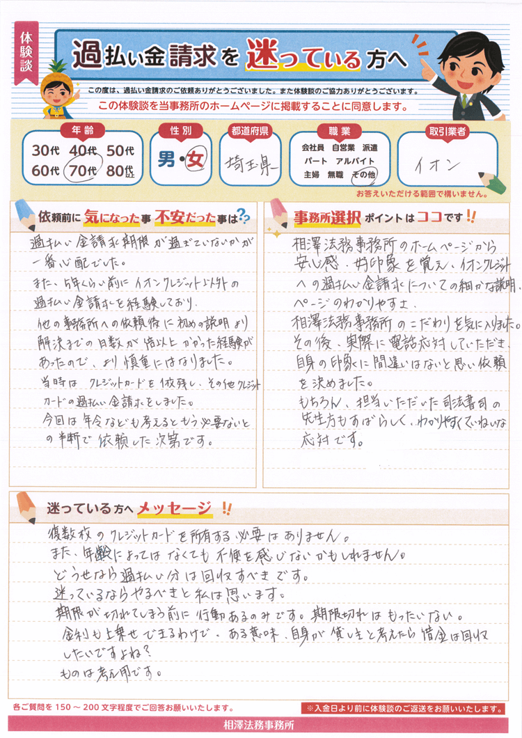 相澤法務事務所のホームページから安心感、好印象を覚え、イオンクレジットへの過払い金請求についての細かな説明ページのわかりやすさ、相澤法務事務所のこだわりを気に入りました。