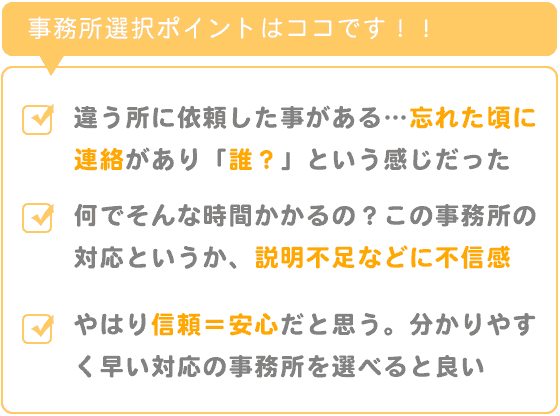 やはり信頼=安心だと思いますのでこちらの相澤さんのように分かりやすく、早い対応をしてくれる事務所を選べると良いですね。