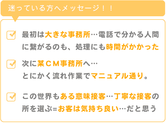 こちらの事務所のように丁寧な接客(言葉が合っているのか・・・私が接客業なもので・・・)をして下さるところを選ぶ=私達お客様は気持ち良いという事だと思います。