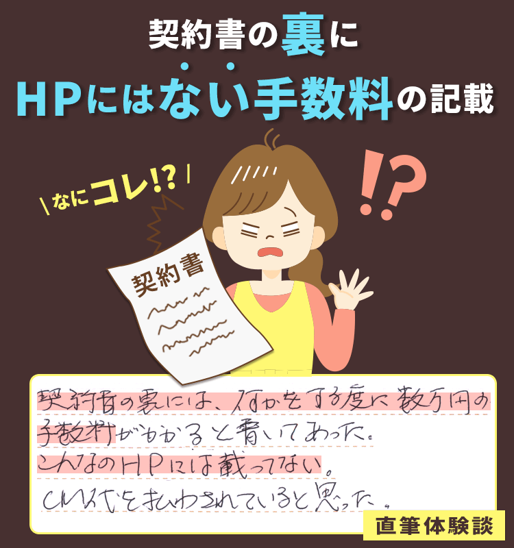 しかし、契約書の裏には、何かをする度に「数万円の手数料がかかる」と書いてあるではないか。