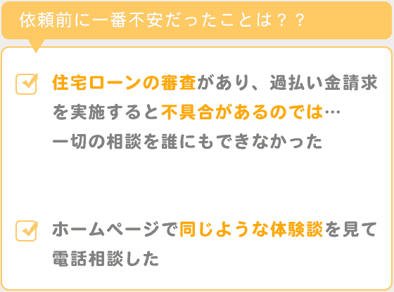 住宅ローンの審査があり、過払い金請求を実施すると不具合があるのではないかと思い、一切の相談を誰にもできませんでした。