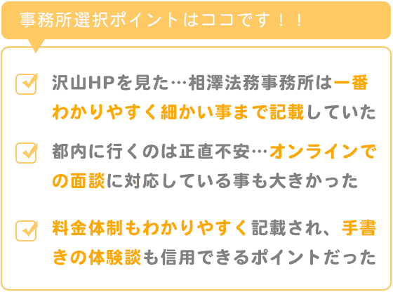 沢山の事務所のホームページを見た中で相澤法務事務所は一番わかりやすく細かい事まで記載されていました。