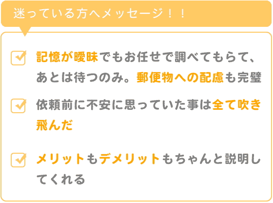 細かい情報を覚えてなくてもお任せで調べてもらえます。あとはただ待つのみです。郵便物への配慮も完璧にしてくれます。