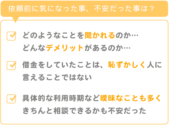 自分にとって借金をしていたことは、恥ずかしく人に言えることではないと思っていたので具体的な利用時期など曖昧なことも多くきちんと相談できるかも不安でした。