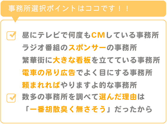 お昼時にテレビで何度も繰り返し同じコマーシャルを打っている事務所やラジオ番組のスポンサーになっている事務所。
