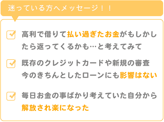 高利で借りて払い過ぎた金利というお金がもしかしたら返ってくるかも知れないと考えてみて下さい。