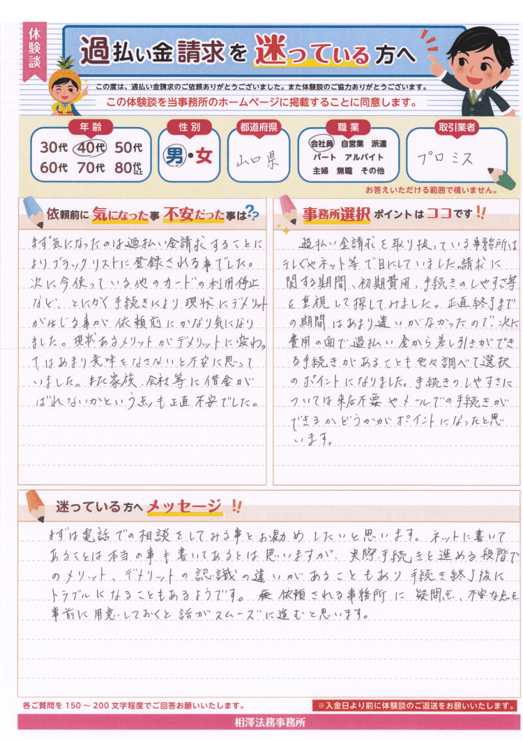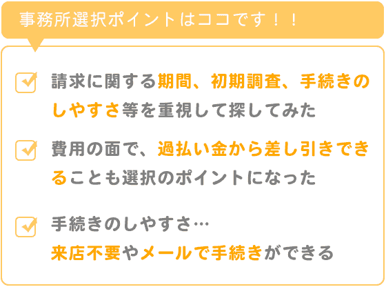 過払い金請求を取り扱っている事務所はテレビやネット等で目にしていました。請求に関する期間、初期調査、手続きのしやすさ等を重視して探してみました。