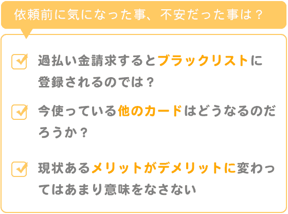 次に今使っている他のカードの利用停止など、とにかく手続きにより現状にデメリットが生じる事が依頼前にかなり気になりました。現状あるメリットがデメリットに変わってはあまり意味をなさないと不安に思っていました。