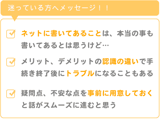 ネットに書いてあることは本当の事も書いてあるとは思いますが、実際、手続きを進める段階でのメリット、デメリットの認識の違いがあることもあり手続き終了後にトラブルになることもあるようです。