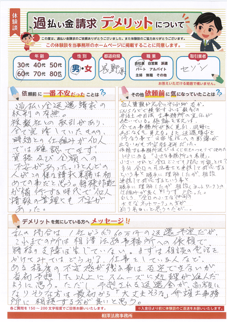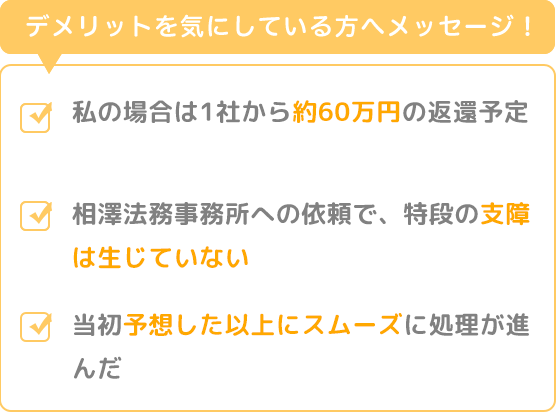 私の場合は1社から約60万円の返還予定だが、これまでの所は相澤法務事務所への依頼で、特段の支障は生じていない。