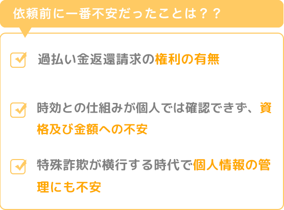 複数社との取引があり、全て完済していたものの、時効との仕組みが個人では確認できず、資格及び金額への不安があった。