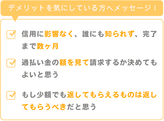 なので過払い金請求の対象なのかもわからず、相談してみようと決意するまでに時間がかかりました。