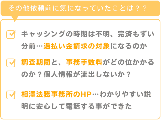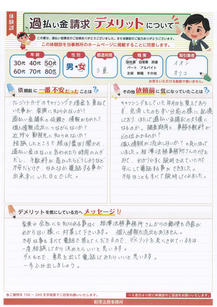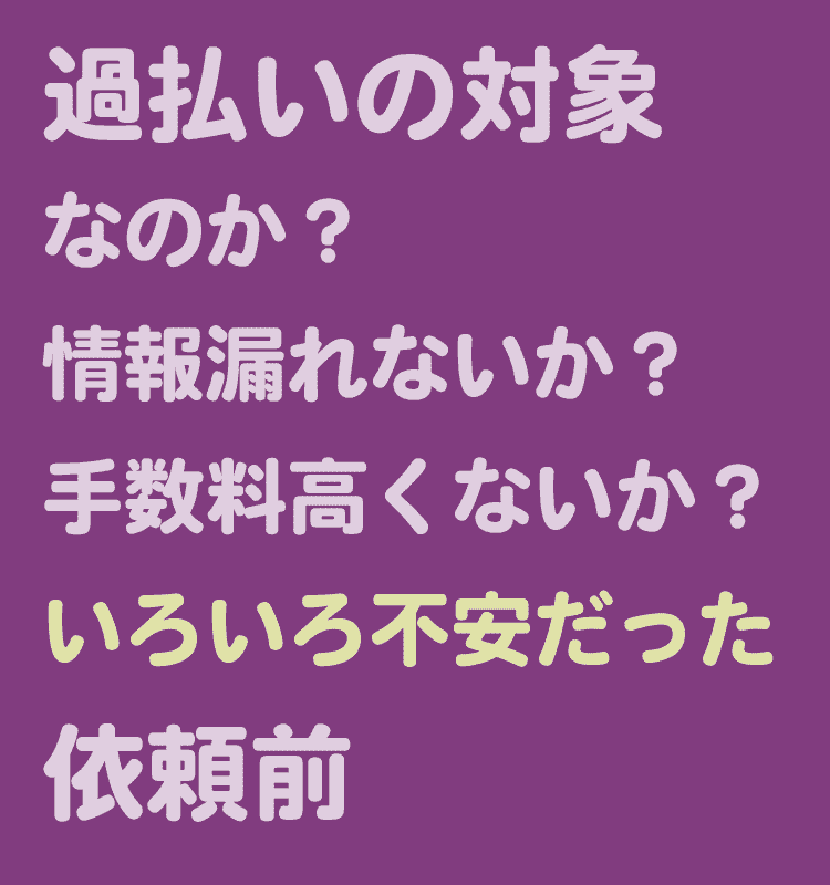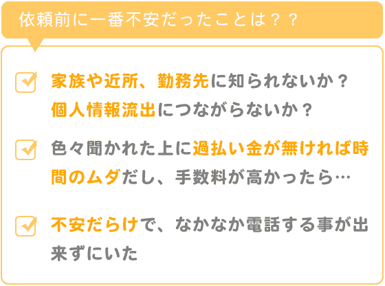 クレジットカードのキャッシングで借金を重ねていた事が、家族に知られないか?過払い金請求の依頼で、情報がもれたり個人情報流出につながらないか?近所や勤務先に知られないか?相談したところで根ほり葉ほり聞かれ、過払い金はないと言われたら時間のムダだし、手数料が高かったらどうしようなど不安だらけで、なかなか電話する事が出来ずにいた日々でした。