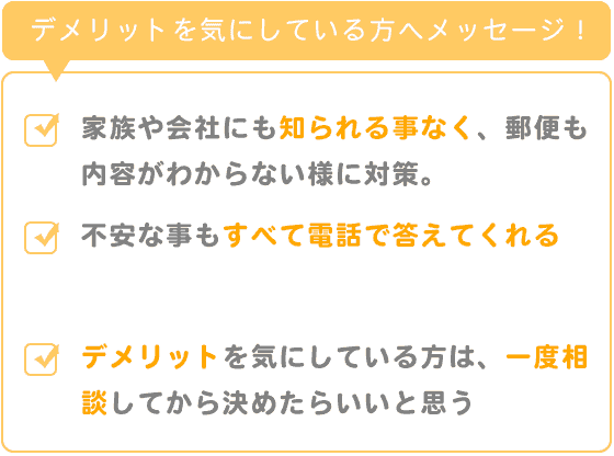 不安な事もすべて電話で答えてくださるので、デメリットを気にされている方は、一度相談してから決めたらいいと思います。