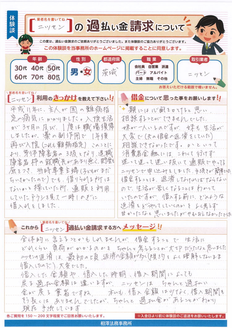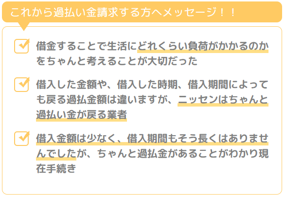 借入した金額や、借入した時期、借入期間によっても戻る過払金額は違いますが、ニッセンはちゃんと過払い金が戻る業者ですね。