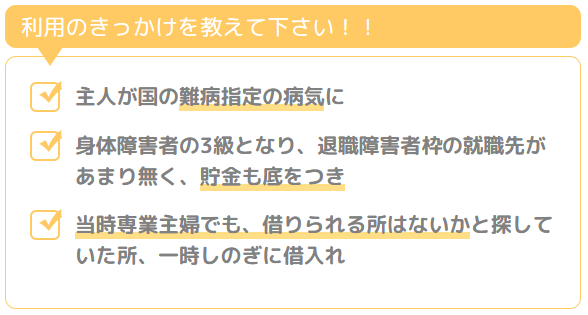 平成11年に、主人が国の難病指定の病気にかかりました。入院生活が3ヶ月に及び、1度は職場復帰しましたが、薬の副作用で1年後再び入院(これも難病指定)このことにより、身体障害者の3級となり、退職障害者枠の就職先があまり無く、貯金も底をつき、当時専業主婦(子どもがまだちいさかったので)でも、借りられる所はないかと探していた所、通販を利用していたチラシを見て一時しのぎに借入れをしました。