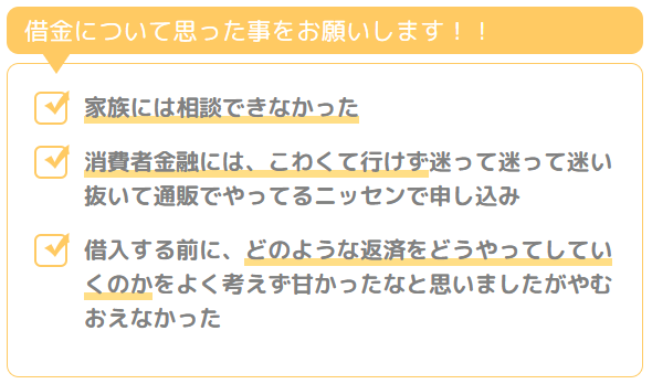 借金することは、返済しなければならないので、生活が苦しくなることはわかっていたのですが、借入する前に、どのような返済をどうやってしていくのかをよく考えず甘かったなと思いましたがやむおえなかったでした。