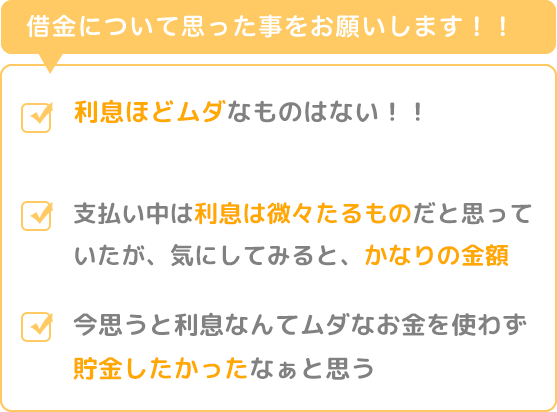 今思うと利息なんてムダなお金を使わず貯金したかったなぁと思います。