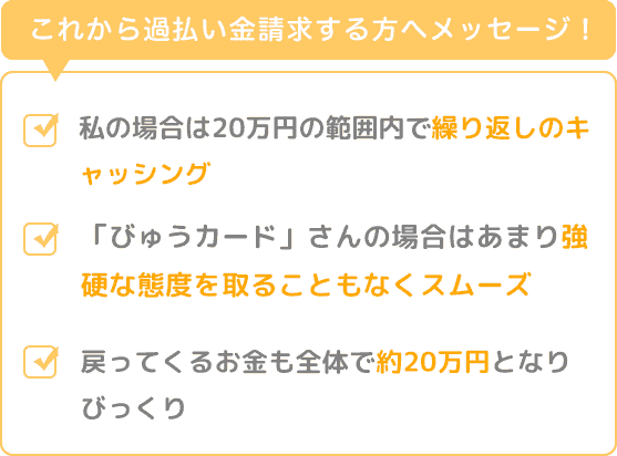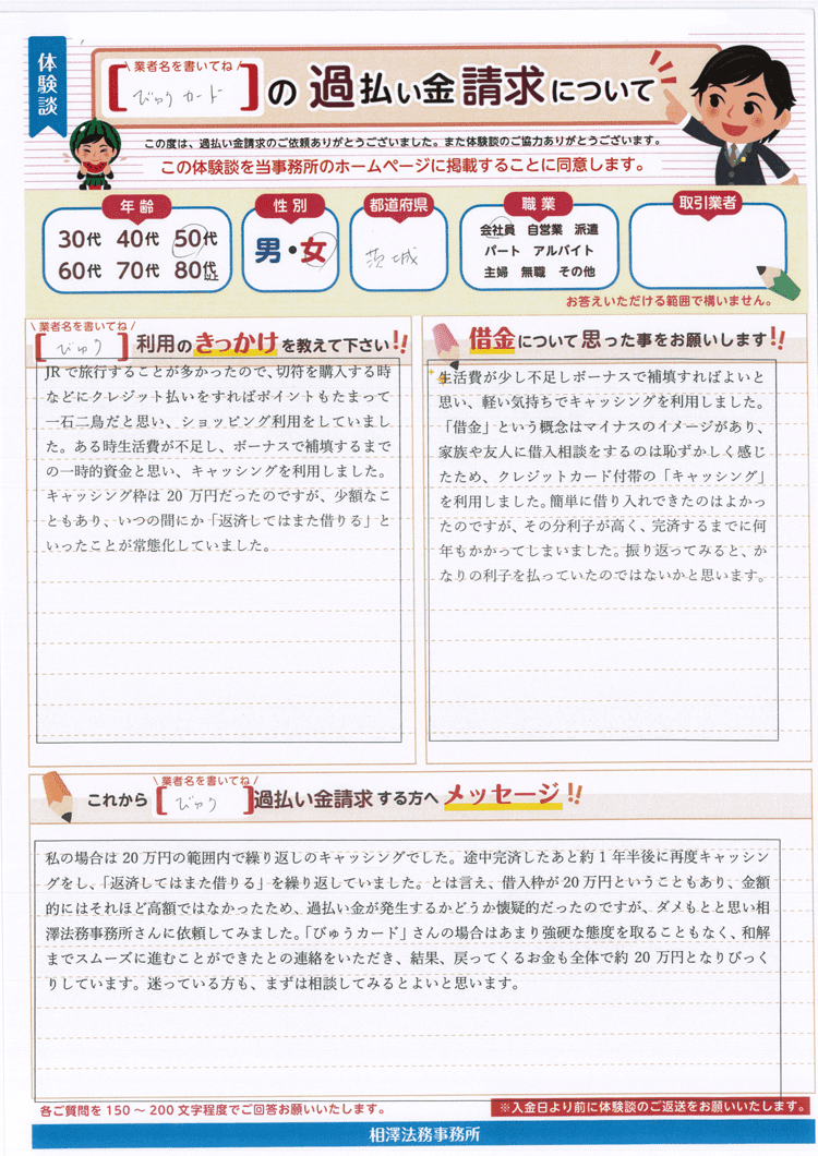 「びゅうカード」さんの場合はあまり強硬な態度を取ることもなく、和解までスムーズに進むことができたとの連絡をいただきました。結果、戻ってくるお金も全体で約20万円となりびっくりしています。