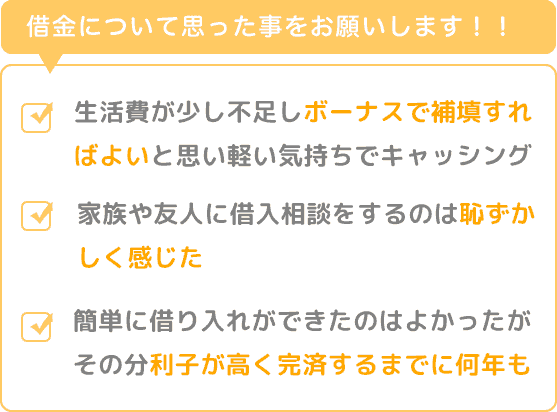 ある時生活費が不足し、ボーナスで補填するまでの一時的資金と思い、キャッシングを利用しました。