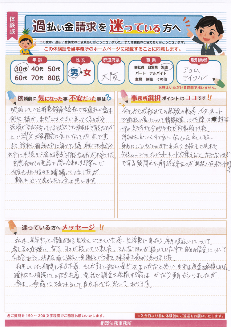 利用していた期間も長かった為、もしかすると過払い金があるのかなと思い、まずは調査を依頼しました。